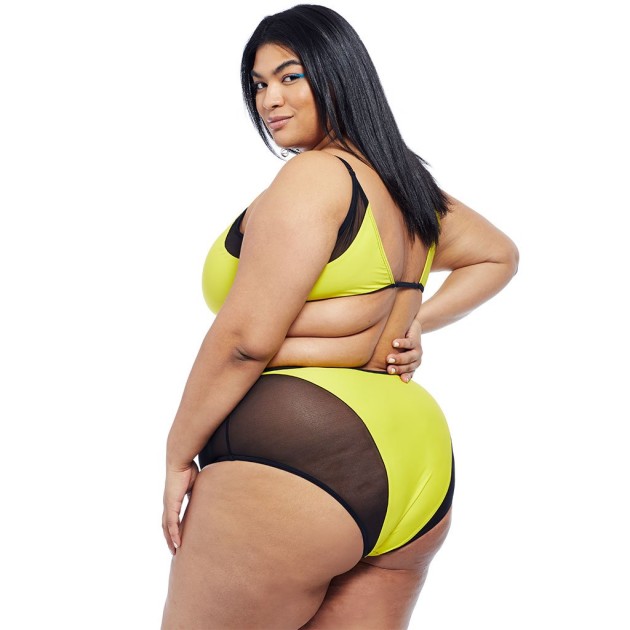 The Chromat Mikito Bottom: This yellow lycra high-rise bikini bottom with high cut legs, contrast mesh panels and black lycra binding goes up to a 2X and the suit is ethically made in Sofia, Bulgaria from luxe and sustainable Italian fabric. This swimsuit is made with sustainable, regenerated nylon spun from recycled fishing nets, meaning you look amazing while doing your bit for the planet!