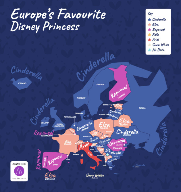Europe was largely split between one of the classic Disney princesses, Cinderella and a much more recent favourite, Elsa of Arendelle.