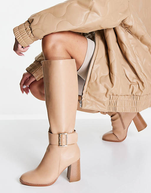 ASOS Design Charlotte heeled knee boots with buckle trim in camel (RRP €56.99)