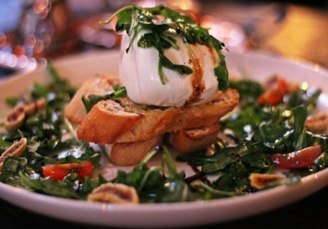 Place your washed salad leaves in a serving bowl. Scatter in your cherry tomatoes and place your whole burrata in the bowl, spaced out.
