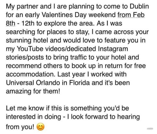 “As I was searching for places to stay, I came across your stunning hotel and would love to feature you in my YouTube videos/dedicated Instagram stories/posts to bring traffic to your hotel and recommend others to book up in return for free accommodation.”