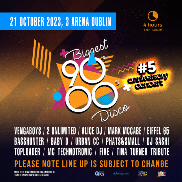 Tickets for The Biggest 90's-00's Disco are available now at Ticketmaster.ie, with prices starting at just €50 (additional Ticketmaster charges may apply).