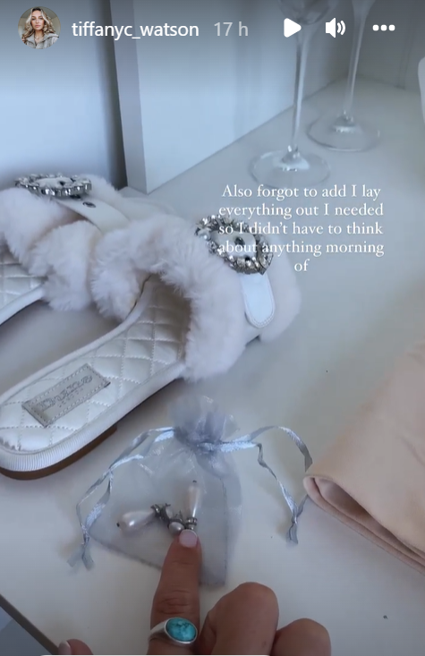 The 28-year-old also shared videos from the day before the wedding. In them, the church were practising the bell ringing for after the ceremony, Tiffany showed the gorgeous gifts she prepared for each bridesmaid, the bridal party were playing tennis with Tiffany’s dad and Tiffany was setting out everything for the next day, from her slippers to the earrings she was going to wear.