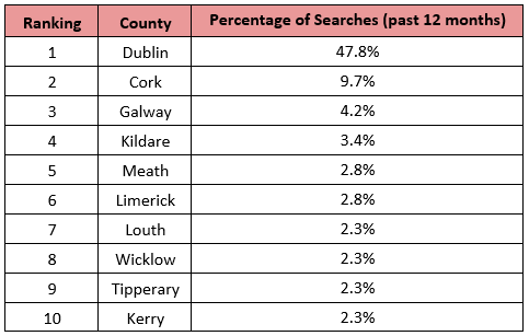 Dublin tops the list with 48% of the search volume across Ireland! Cork comes in second at 10% searches in the last year. Meanwhile, Galway placed third at 4%, Kildare landed the fourth spot at 3.5% and Meath came in fifth with 3% of searches. Limerick, Louth, Wicklow, Tipperary and Kerry also make up the top ten of chocolate lovers!