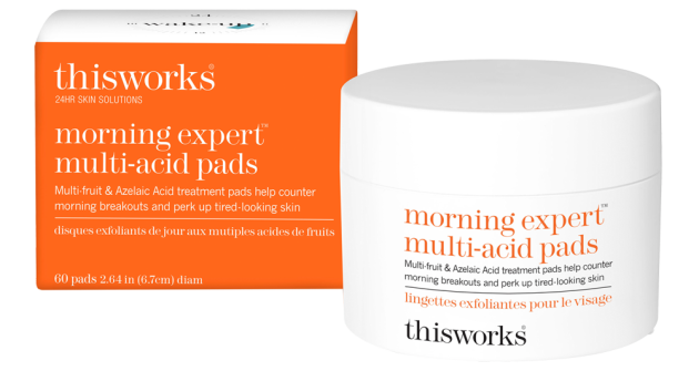 Stop morning breakouts with the This Works Morning Expert Multi-acid Pads, an exfoliating product that can be easily incorporated into a morning skincare routine to start the day with a smoother and brighter complexion.Infused with alpha-hydroxy acids to remove dead skin cells and unclog blocked pores, encouraging skin resurfacing and with vitamin B3 to brighten skin. Enhanced with a blend of azelaic acid and liquorish root, these pads help to reduce the appearance of blemishes and calm inflamed skin.