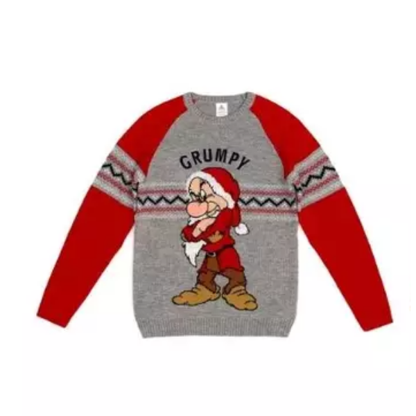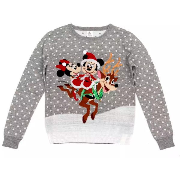 The women’s jumper on the other hand, is absolutely adorable. While the jumper is mainly grey with white polka dots, the front features a snow scene with Mickey and Minni Mouse dressed as Mr. and Mrs. Clause, riding on the back of a reindeer.