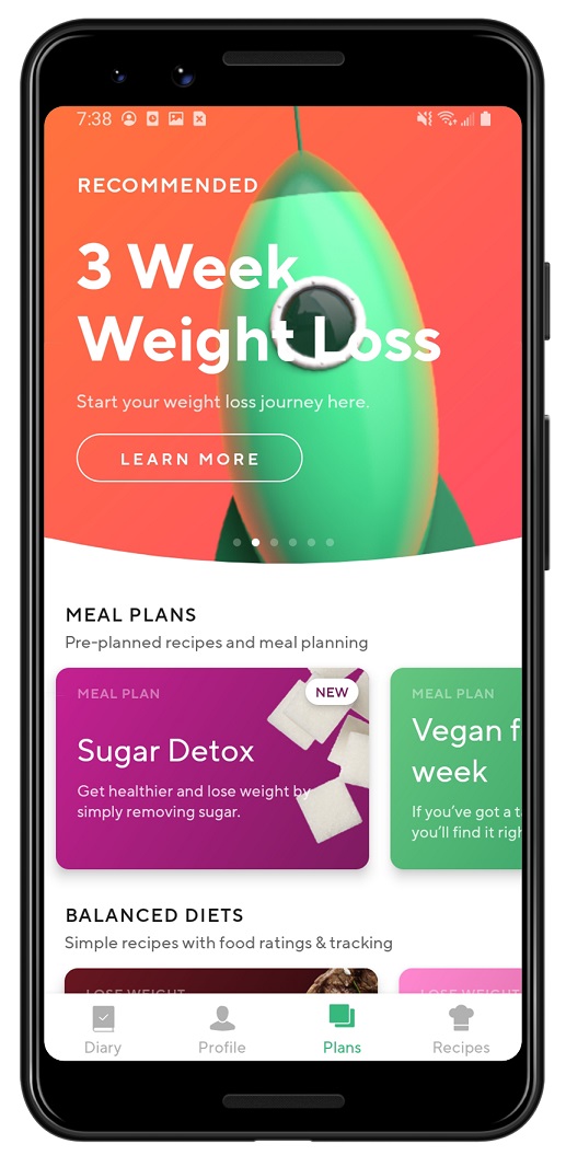 7-21-day Meal Plans: For example, Vegan for a week, Keto Burn, 3 Week Weight Loss, that provide users with four tasty, pre-planned recipes a day