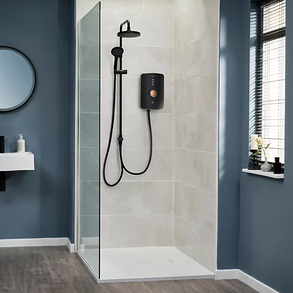 Modern styling meets accessible technology in this energy-efficient shower which not only looks good but also saves water, energy, and money. Available in black with brushed brass or brushed copper effect trims and temperature dial, the Amala Metallic Electric Shower comes with an easy-clean, five-spray pattern shower head and slender riser rail kit for the ultimate minimalist appeal. It’s also available in a DuElec shower configuration which lets you seamlessly switch between a handheld and a rainfall showerhead.
