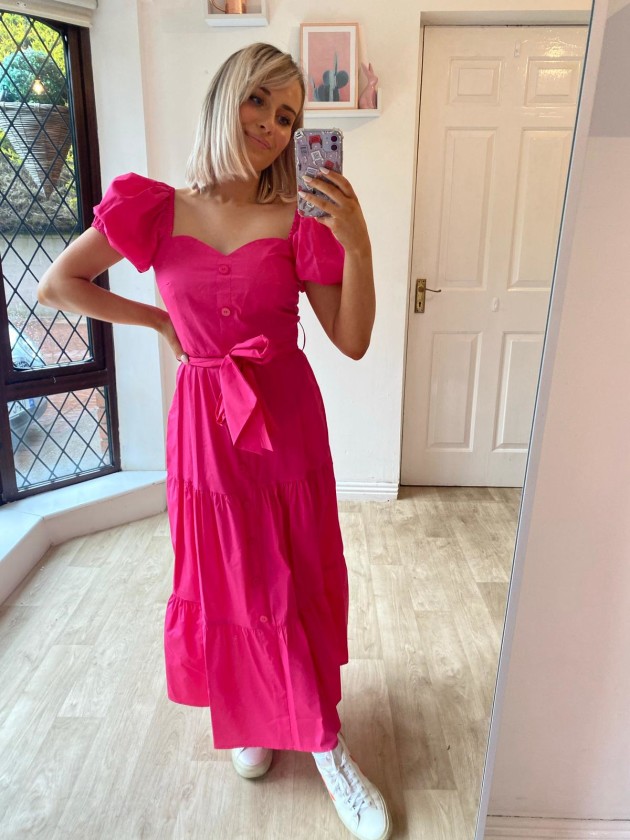 Make a statement in this midi bardot style dress! The fuchsia pink pop of colour is the perfect pop of summer colour, the vibrant tone pairing well with the short puffball sleeves and flared skirt. Such a feminine, versatile summer dress!