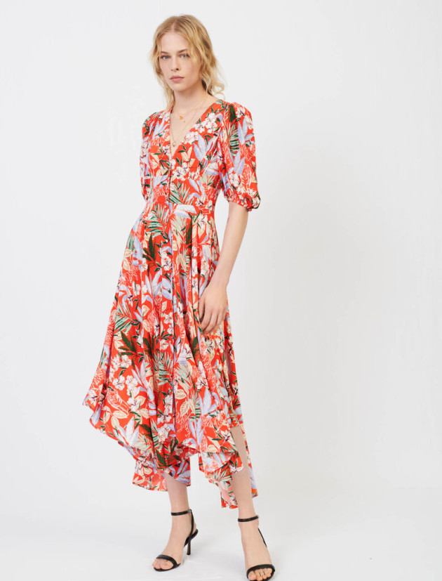 This Long, flowing coral dress with a jungle print, in viscose crêpe is nipped in at the waist for a feminine, classy look. Loose-fitting, flowing sleeves, gathered at the bottom gives you a little more coverage, though the V-neck and panelling at the waist give you lots of shape still. The asymmetric hem adds an interesting detail that will look fab twirling on the dancefloor!