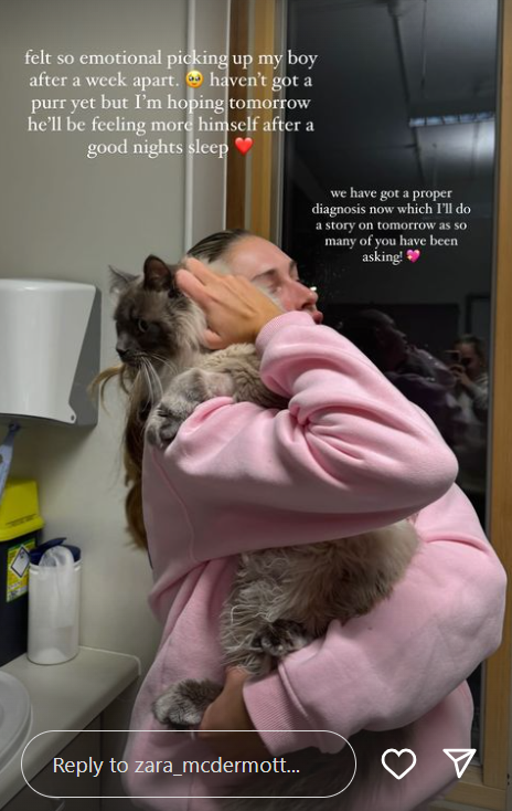 Sharing the good news that Cedric is now home from the animal hospital, Zara revealed what caused her cat to be so unwell and explained his diagnosis.
